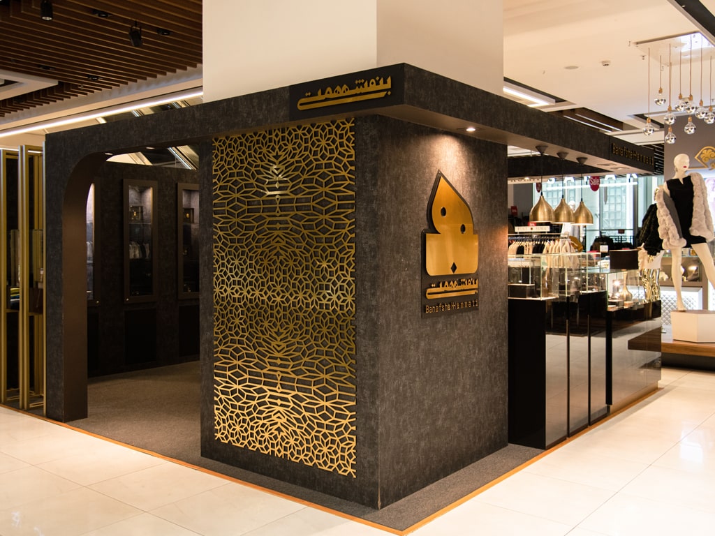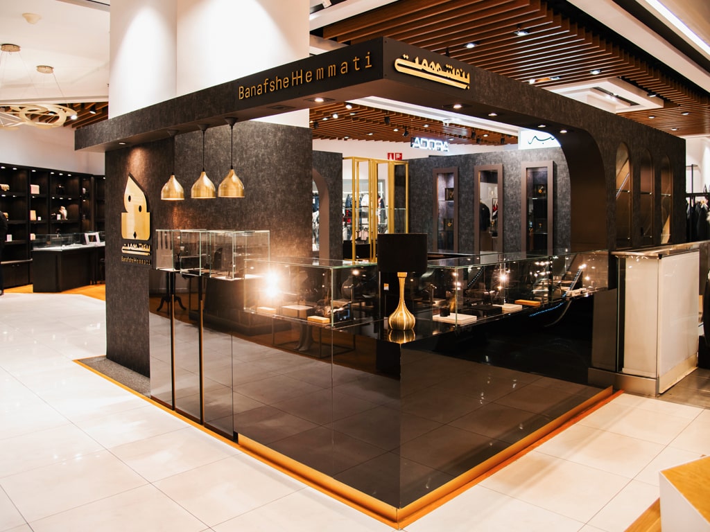 The interior design of Banafshe Hemmati Jewelry Store, featuring a black and gold color palette, creates a luxurious and balanced space where the strong contrast between these two colors makes the jewelry the focal point.
